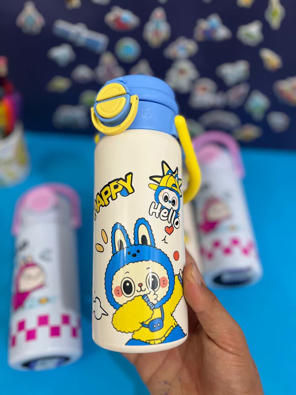 قمقمه استیل طرح لبوبو 550 میلی،دسته دار درب دکمه‌ای – نگه‌دارنده گرم و سرد + تفاله‌گیر