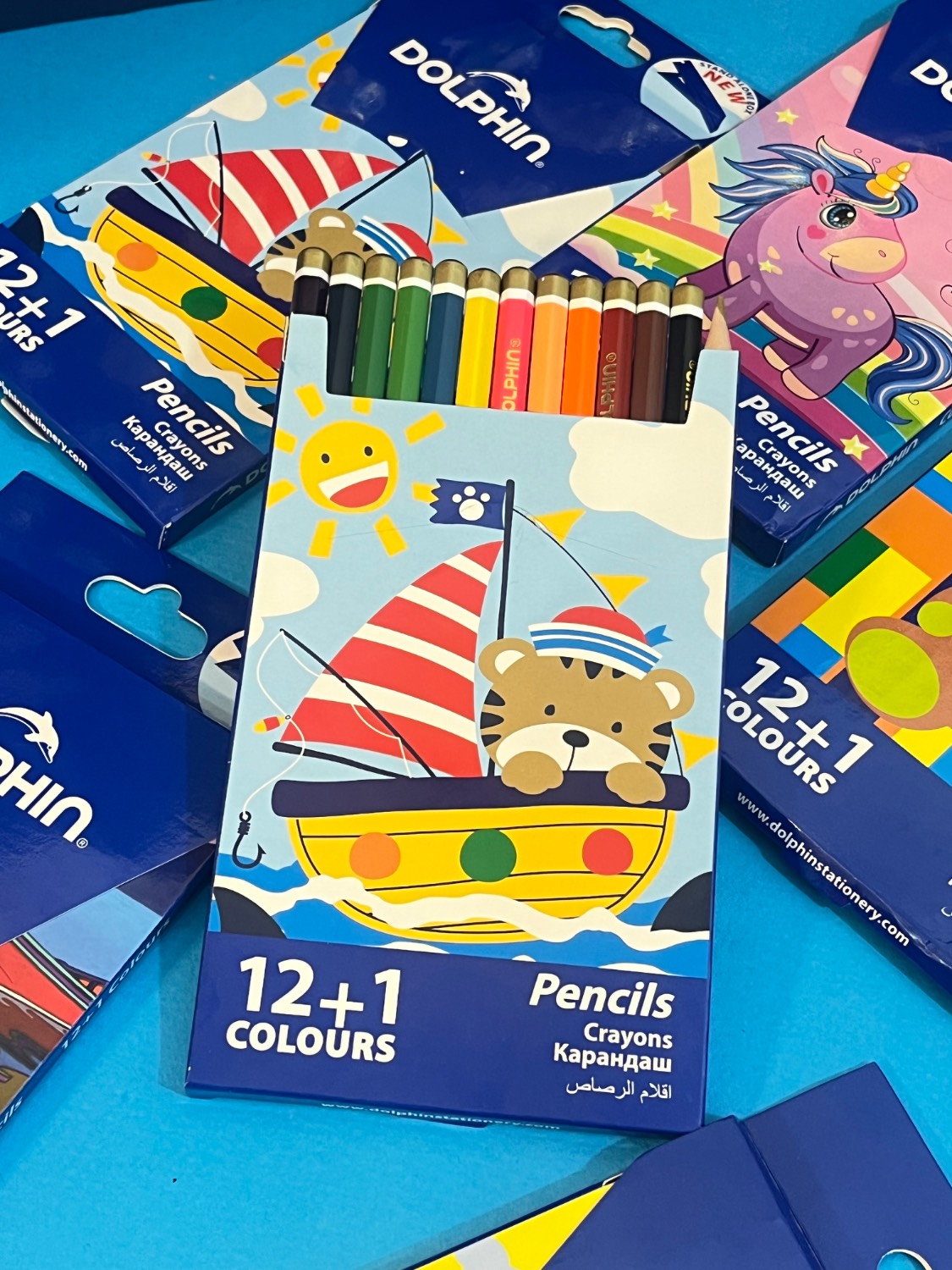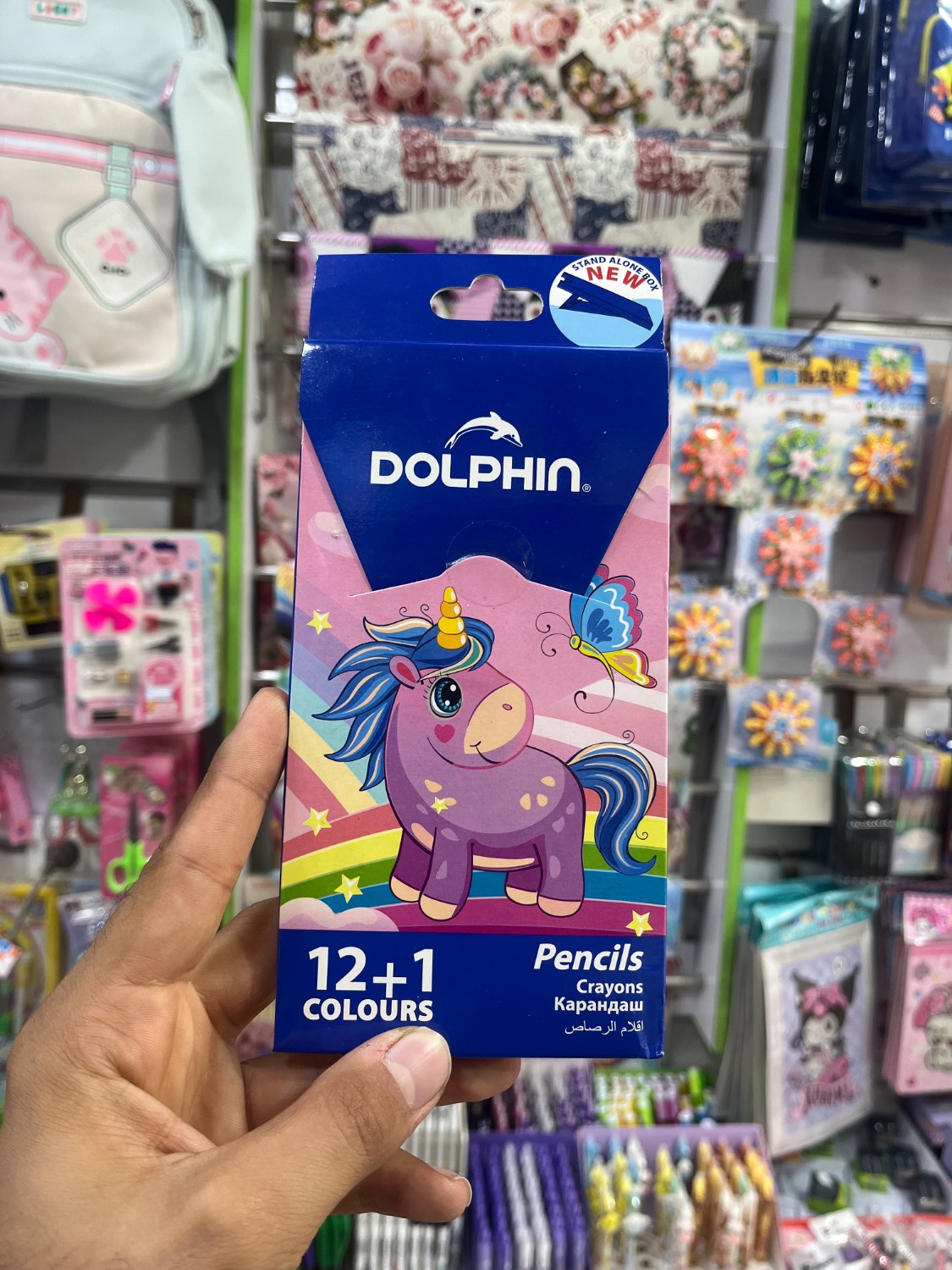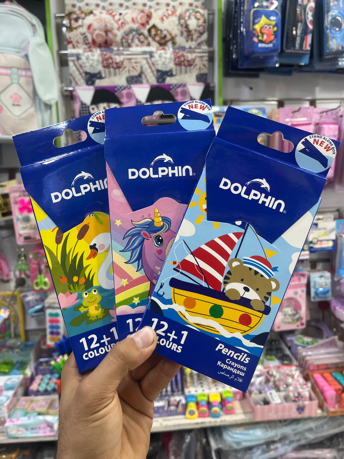 دلفین، برند معتبر اماراتی که با همکاری بهترین تولید کنندگان جهان (از جمله کارخانههای معتبر اروپایی و آسیایی)، محصولاتی با استانداردهای بینالمللی تولید میکند. مدادهای رنگی دلفین، بدون بو، بیخطر، با رنگهای پایدار و مقاوم در برابر خشک شدن، و قابلیت ترکیب رنگها به راحتی را ارائه میدهند.
